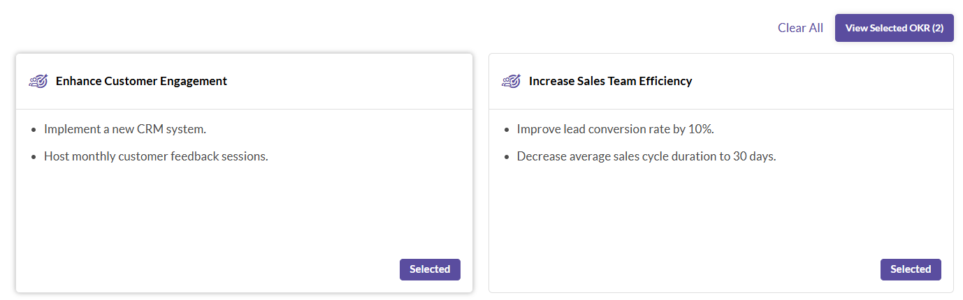 - After selecting the different OKRs, you can click on the View Selected OKR button to proceed further.