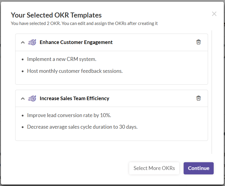 - When the button is clicked, it shows the list of selected OKRs. The individual key results, or the entire OKR can be deleted by clicking on the delete icon next to each entity.